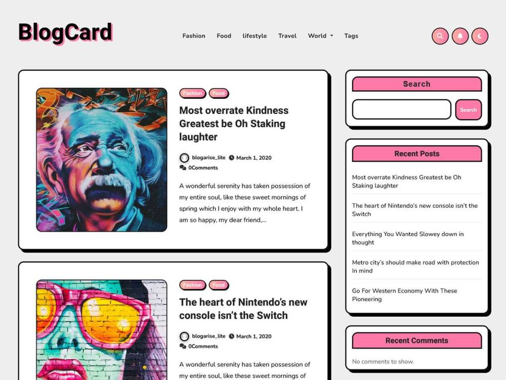 Blog Card is a fast, clean, modern and responsive news magazine WordPress theme. The theme is fully widgetized, so users can manage content using easy-to-use widgets. Blog Card is suitable for dynamic news, newspapers, magazines, editorials, blogs, publishers, online and gaming magazines, news portals, personal blogs, newspapers, publishing or review sites and any creative website. Blog Card supports SEO, WPML, Gutenberg, translation and RTL. Live preview: https://demos.themeansar.com/blogarise/Blog cards/ and documentation at https://docs.themeansar.com/docs/blogarise/
