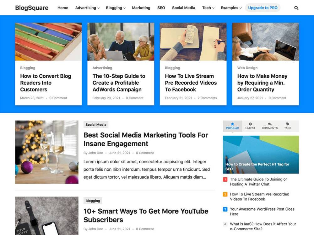 BlogSquare is a modern and clean WordPress theme for blogs and content-driven websites. It provides a great showcase for your content, perfect for individual bloggers and content creators. Theme Demo: https://demo.wpenjoy.com/blogsquare/ Documentation: https://wpenjoy.com/documentation/blogsquare/