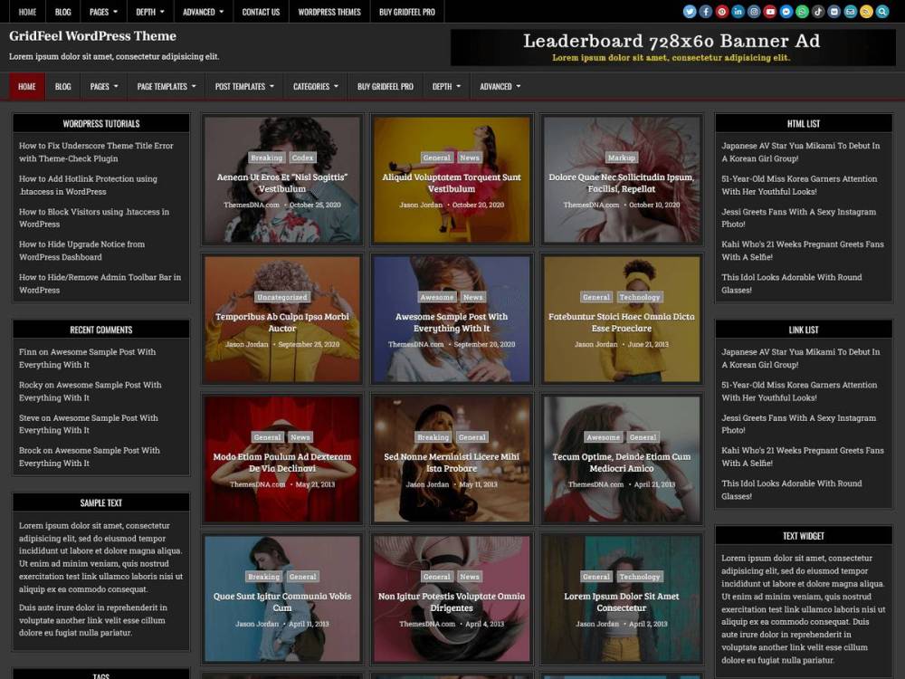 Gridfeel is a 100% responsive and visually appealing three column grid WordPress theme for dark theme fans. It is ideal for creating news, gallery or photography portfolio websites. It has customization theme options, 3 column post grid, two navigation menus, full width post/page templates, sticky menu and sticky sidebar, 6 column footer, RTL language support, 60+ social buttons and much more. Gridfeel Pro version has multiple color and font options, 1-10 column grid layout, 10+ grid thumbnail sizes, news ticker, 2 grid types (CSS grid or masonry grid), 10+ layout styles with width options, boxed or full layout types, 10+ custom post/page templates, 2 header styles with width options, footers from 1 to 6 columns, ads between grid posts, grid/list/tab featured post widgets, width/layout type/layout style/header style/footer style options for each post/page, settings panel for each post/page, header image unique for each post/page, post likes and post views, social widgets, more widget areas, 25+ share buttons, related posts, infinite scrolling and more features and many more. Free demo version: https://demo.themesdna.com/gridfeel/